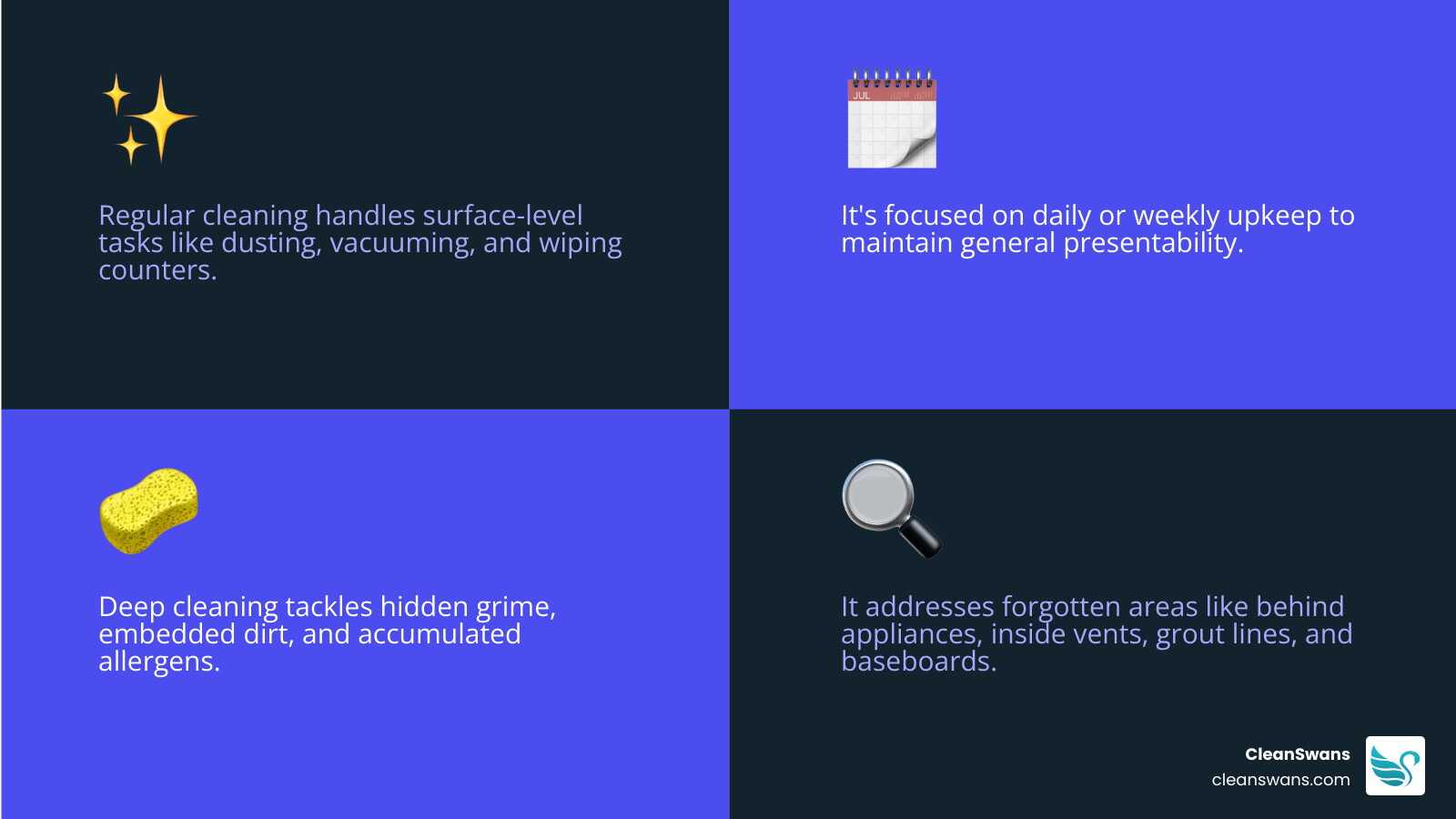 - Regular Cleaning handles surface-level tasks: dusting, vacuuming, wiping counters.