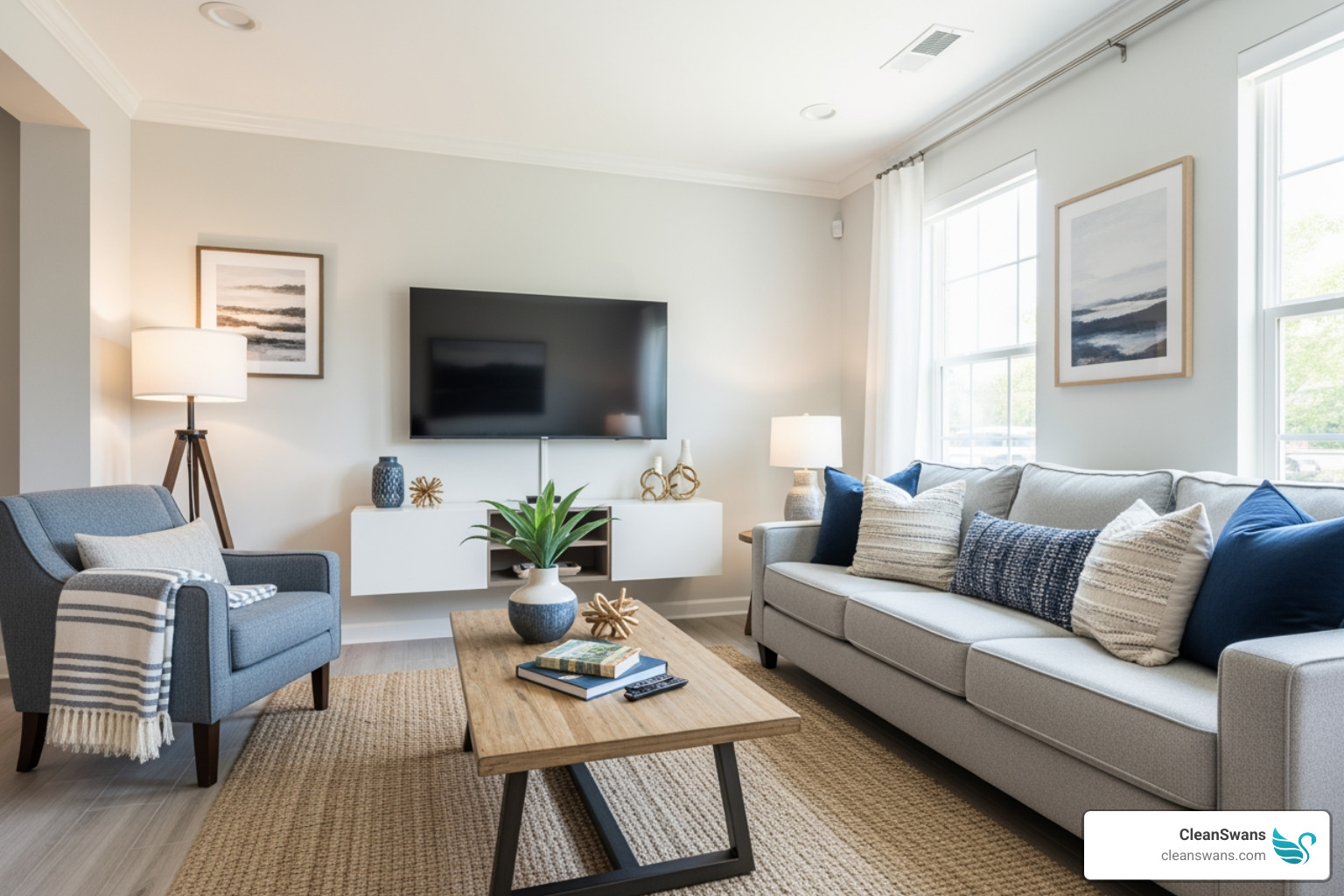 • Living Area Refresh: This is where guests relax and socialize. We dust all surfaces, including blinds, shelves, and decor. Sofa cushions are checked for dirt or stains, removed, and cleaned underneath. Furniture is vacuumed, and floors are swept, vacuumed, or mopped. Windows and sliding glass doors are cleaned. High-touch surfaces like remotes, light switches, and door handles are disinfected. Books, games, and decorative items are reorganized and straightened.